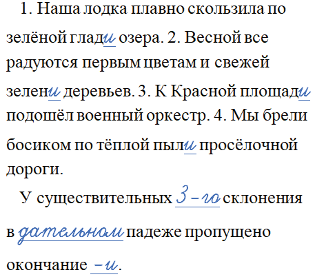 1. Наша лодка плавно скользила по зелёной глад_ озера. 2. Весной все радуются первым цветам и свежей зелен_ деревьев. 3. К Красной площад_ подошёл военный оркестр. 4. Мы брели босиком по тёплой пыл_ просёлочной дороги.
