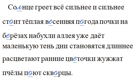 Со..нце греет всё сильнее и сильнее ст..ит тёплая в..сенняя п..года почки на б..рёзах набухли аллея уже даёт маленькую тень дни становятся длиннее расцветают ранние цв..точки жужжат пчёлы п..ют скв..рцы.