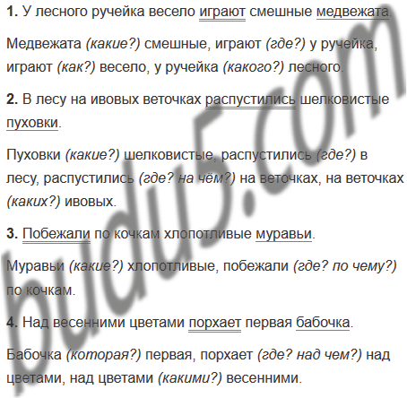 1. У лесного ручейка весело играют смешные медвежата. 2. В лесу на ивовых веточках распустились шелковистые пуховки. 3. Побежали по кочкам хлопотливые муравьи. 4. Над весенними цветами порхает первая бабочка.
