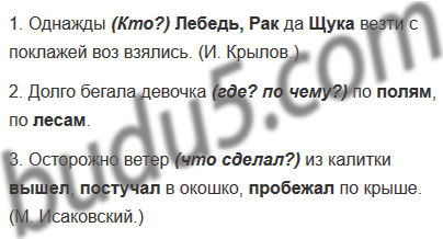 1. Однажды Лебедь, Рак да Щука везти с поклажей воз взялись. (И. Крылов.) 2. Долго бегала девочка по полям, по лесам. 3. Осторожно ветер из калитки вышел, постучал в окошко, пробежал по крыше. (М. Исаковский.)