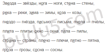 Звезда, нога, стена, река, зима, коза, гнездо, письмо, пчела, плита, окно, пила, страна, плечо, пятно, гроза, сосна.