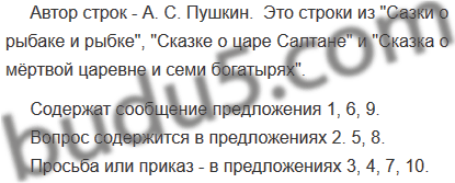 1) Жил старик со своею старухой у самого синего моря. 2) Я ль на свете всех милее, всех румяней и белее? 3) Воротись, поклонися рыбке. 4) Не печалься, ступай себе с богом! 5) Чего тебе надобно, старче? 6) Отпустил он рыбку золотую и сказал ей ласковое слово. 7) Ступай себе в море, гуляй там себе на просторе. 8) Ой вы, гости-господа, долго ль ездили? Куда? 9) Ветер по морю гуляет и кораблик подгоняет. 10) Не губи меня, девица!