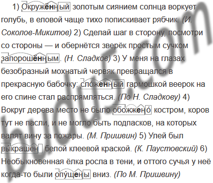 1) Окруж..нный золотым сиянием солнца воркует голубь, в еловой чаще тихо попискивает рябчик. (И. Соколов-Микитов) 2) Сделай шаг в сторону, посмотри со стороны — и обернётся зверёк простым сучком запорош..енным. (Н. Сладков) 3) У меня на глазах безобразный мохнатый червяк превращался в прекрасную бабочку: слож..нный гармошкой веерок на его спине стал распрямляться. (По Н. Сладкову) 4) Вокруг дерева место не было обожж..но костром, коров тут не пасли, и не могло быть подпасков, на которых валят вину за пожары. (М. Пришвин) 5) Улей был выкрашен белой клеевой краской. (К. Паустовский) 6) Необыкновенная ёлка росла в тени, и оттого сучья у неё когда-то были опущ..ны вниз. (По М. Пришвину)