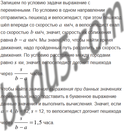 По условию задачи составьте выражение с переменными. Из двух сёл, расстояние между которыми равно км, одновременно в одном направлении отправились пешеход и велосипедист. Через сколько часов после начала движения велосипедист догонит пешехода, если пешеход шёл впереди со скоростью км/ч, а велосипедист ехал со скоростью км/ч? Вычислите значение полученного выражения при = 4, = 12, = 12.