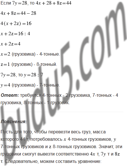 Для перевозки груза выделили 4-, 7- и 8-тонные грузовики. Каждый автомобиль должен сделать только одну ходку. Сколько требуется грузовиков каждого вида для перевозки 44 т груза?