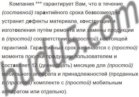 Компания *** гарантирует Вам, что в течение гарантийного срока бе..возмездно устранит д..фекты материала, конструкции и изготовления путём ремонта или замены продукции в соответствии с настоящей гарантией. Гар..нтийный срок начинается с момента покупки пр..дукции пользователем и сост..вляет 12 (двенадцать) месяцев для мобильного аппарата и принадлежностей (проданных в комплекте с мобильным аппаратом или отдельно).