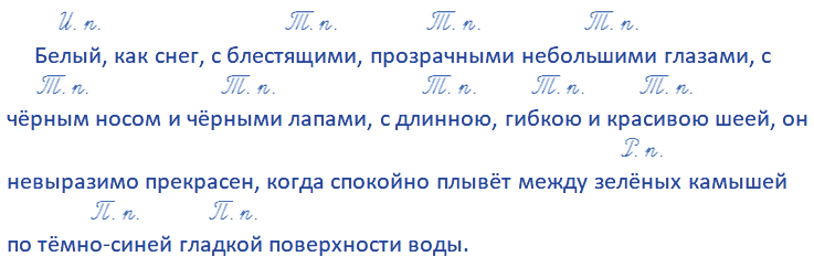 Белый, как снег, с блестящими, прозрачн... небольш... глазами, с чёрн... носом и чёрн... лапами, с длинн..ю, гибк..ю и красив..ю шеей, он невыразимо прекрасен, когда спокойно плывёт между зелёных камышей по тёмно-син... гладк... поверхности воды.