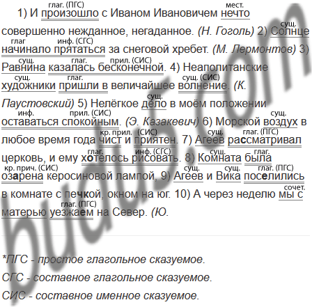1) И произошло с Иваном Ивановичем нечто совершенно нежданное, негаданное. (Н. Гоголь) 2) Солнце начинало прятаться за снеговой хребет. (М. Лермонтов) 3) Равнина казалась бесконечной. 4) Неаполитанские художники пришли в величайшее волнение. (К. Паустовский) 5) Нелёгкое дело в моём положении оставаться спокойным. (Э. Казакевич) 6) Морской воздух в любое время года чист и приятен. 7) Агеев ра..сматривал церковь, и ему х..телось рисовать. 8) Комната была оз..рена керосиновой лампой, 9) Агеев и Вика пос..лились в комнате с печ(?)кой, окном на юг. 10) А через неделю мы с матерью уезжа..м на Север. (Ю. Казаков)