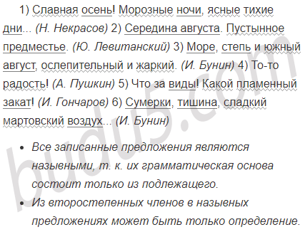 1) Славная осень! Морозные ночи, ясные тихие дни... (Н. Некрасов) 2) Середина августа. Пустынное предместье. (Ю. Левитанский) 3) Море, степь и южный август, ослепительный и жаркий. (И. Бунин) 4) То-то радость! (А. Пушкин) 5) Что за виды! Какой пламенный закат! (И. Гончаров) 6) Сумерки, тишина, сладкий мартовский воздух... (И. Бунин)