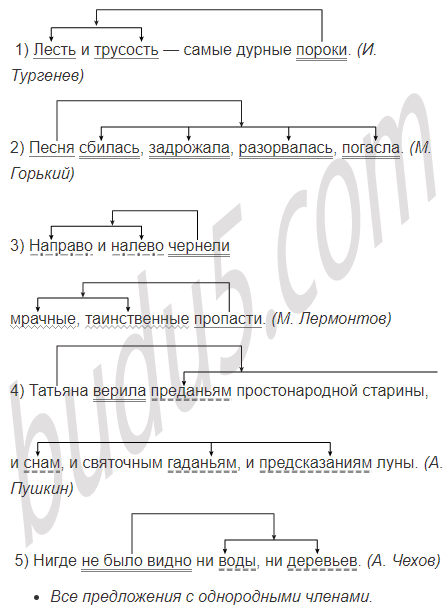 1) Лесть и трусость — самые дурные пороки. (И. Тургенев) 2) Песня сбилась, задрожала, разорвалась, погасла. (М. Горький) 3) Направо и налево чернели мрачные, таинственные пропасти. (М. Лермонтов) 4) Татьяна верила преданьям простонародной старины, и снам, и святочным гаданьям, и предсказаниям луны. (А. Пушкин) 5) Нигде не было видно ни воды, ни деревьев. (А. Чехов)