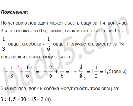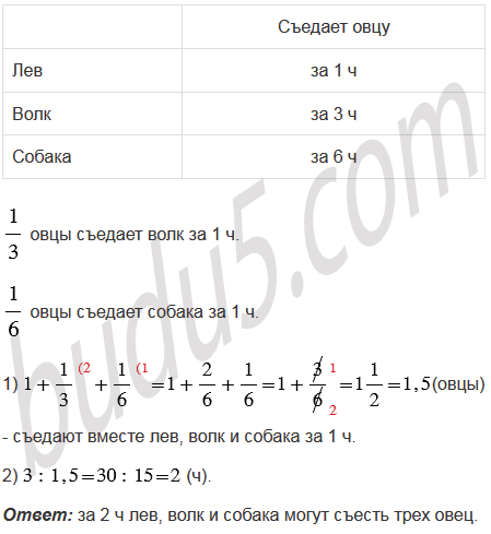 (Задача из немецкого фольклора.) За какое время лев, волк и собака могут съесть трех овец, если лев один может съесть овцу за 1 ч, волк - за 3 ч, а собака - за 6 ч?