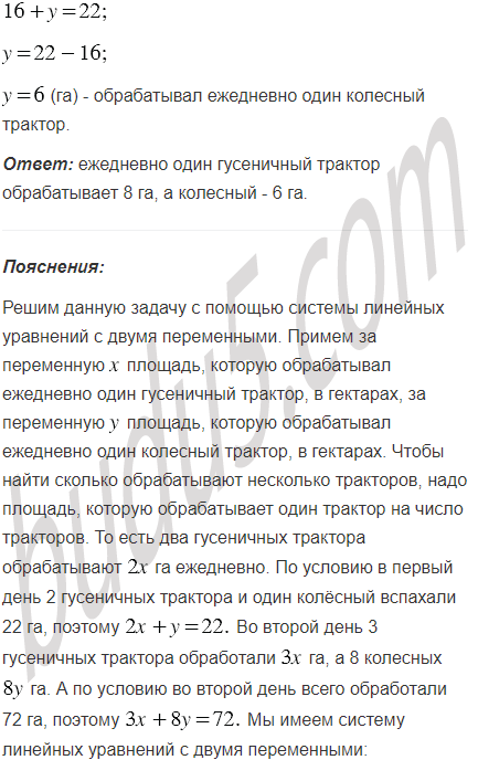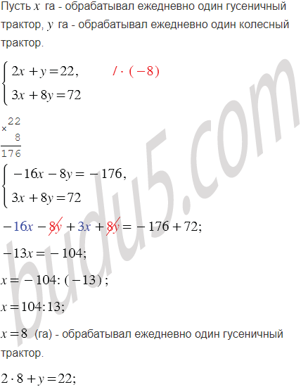 В первый день 2 гусеничных трактора и один колёсный вспахали 22 га,  а во второй день 3 гусеничных и 8 колёсных - 72 га. Найдите, сколько гектаров земли обрабатывал ежедневно один гусеничный трактор и сколько - один колёсный.