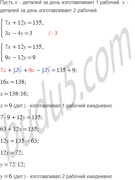 Двое рабочих изготовили 135 деталей. Первый рабочий работал 7 дней, а второй - 12 дней. Сколько деталей изготавливал ежедневно каждый рабочий, если первый за 3 дня сделал на 3 детали больше, чем второй за 4 дня?