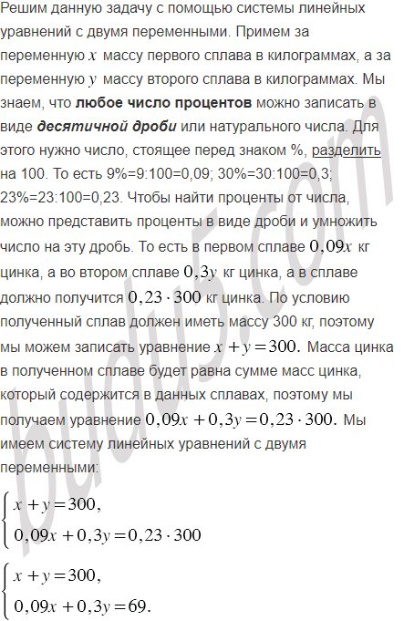 Имеем два сплава меди и цинка. Один сплав содержит 9%, а другой - 30% цинка. Сколько килограммов каждого сплава надо взять, чтобы получить сплав массой 300 кг, содержащий 23% цинка?