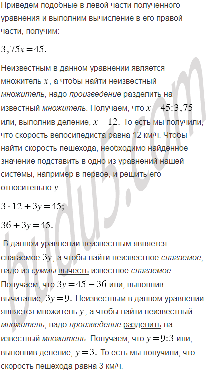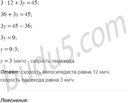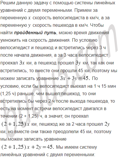 Из двух сёл, расстояние между которыми равно 45 км, одновременно навстречу друг другу отправились велосипедист и пешеход и встретились через 3 ч после начала движения. Если бы велосипедист выехал на 1 ч 15 мин раньше, чем вышел пешеход, то они встретились бы через 2 ч после выхода пешехода. С какой скоростью двигался каждый из них?