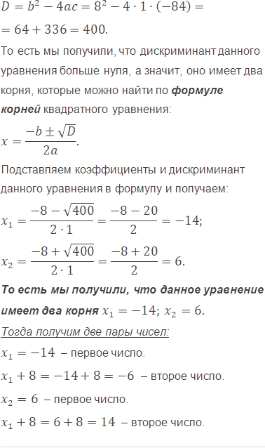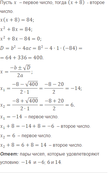 Произведение двух чисел равно 84. Найдите эти числа, если одно из них на 8 меньше другого.