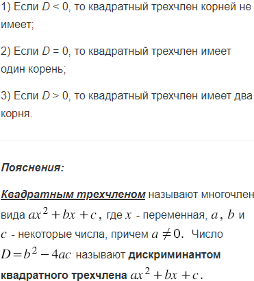 В каком случае квадратный трехчлен не имеет корней; имеет один корень? Имеет два корня?