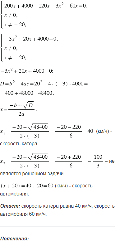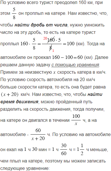 всего пути на катере, а остальную часть проехал на автомобиле. Скорость автомобиля на 20 км/ч больше скорости катера. На автомобиле он ехал на 1 ч 30 мин меньше, чем плыл на катере. Найдите скорость автомобиля и скорость катера, если всего турист преодолел 160 км.