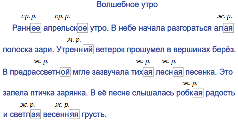 Ранн... апрельск... утро. В небе начала́ разгораться ал... полоска2 зари3. Утренн... в..т..рок пр..шумел в в..рш..нах берёз. В пр..драссветной мгле з..звучала тих... лесн...2 песенка. Это з..пела птичка зарянка. В её песне слышалась робк... радость и светл... весенн... грусть.