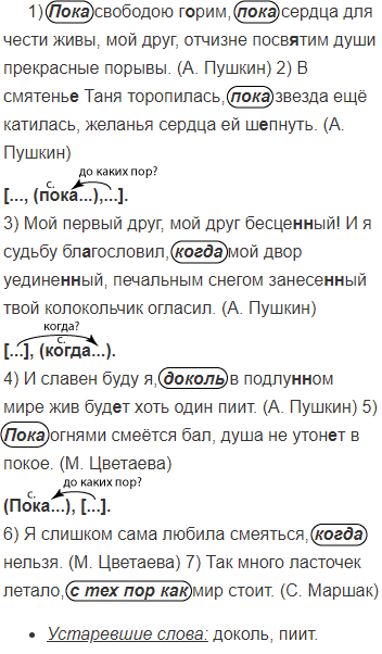 1) Пока свободою г..рим пока сердца для чести живы мой друг отчизне посв..тим души прекрасные порывы. (А. Пушкин) 2) В смятень.. Таня торопилась пока звезда ещё катилась желанья сердца ей ш..пнуть. (А. Пушкин) 3) Мой первый друг мой друг бесце(н, ин)ый! И я судьбу бл..гословил когда мой двор уедине(н, нн)ый печальным снегом занесе(н, нн)ый твой колокольчик огласил. (А. Пушкин) 4) И славен буду я доколь в подлу(н, нн)ом мире6 жив буд..т хоть один пиит. (А. Пушкин) 5) Пока огнями смеётся бал душа не утоп..т в покое. (М. Цветаева) 6) Я слишком сама любила смеяться когда нельзя. (М. Цветаева) 7) Так много ласточек летало с тех пор как мир стоит. (С. Маршак)