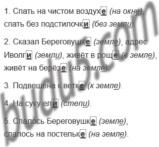 1. Береговушка и говорит: ”Не привыкла я на чистом воздух_ спать, на голом песке, без подстилочк_!“ 2. И Голубь сказал Береговушк_ адрес Иволг_. Живёт Иволга в рощ_, на самой красивой берёз_. 3. Высоко над землёй к ветк_ подвешена корзиночка. 4. Смотрит Бере- говушка: на суку высокой ел_ выстроен дом. 5. Сладко спалось в ту ночь усталой маленькой Береговушк_ у себя на мягкой постельк_ из травинок и перьев.